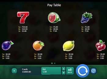 Аппарат Juice’n’Fruits состоит из пяти трехсимвольных барабанов, под которыми находятся разноцветные кнопки для настройки и активации спинов. По ячейкам симулятора перемещаются спелые лимоны, сочные арбузы, сладкие сливы, виноградные гроздья и красные вишенки. Формирование комбинаций сопровождается танцевальной музыкой, добавляющей праздничной атмосферы в азартное интернет развлечение.