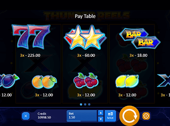 Барабаны Грома представлен в виде небольшого игрового аппарата от Playson, состоящего всего из девяти ячеек и простейшей панели управления. Благодаря вышеуказанным качествам разобраться в слот-машине Thunder Reels сможет даже начинающий геймер. Несмотря на это, перед тем как играть на деньги, не упустите возможность испытать свои силы в демосимулятора. Новая игра имеет красивую, но не излишне яркую графику. Набор барабанов расположился на фоне темно-синего неба, рассекаемого молниями, а среди участвующих в розыгрыше символов встречаются спелые лимоны, сочные сливы, сладкие вишенки, золотые звездочки, яркие семерки и таблички с надписями »bar».